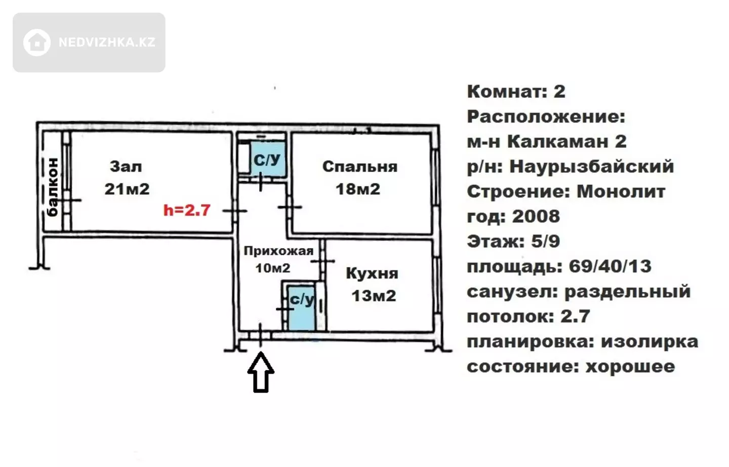 💥Продается отличная 2х ком квартира 💥Район с развитой инфраструктурой в городе. Все самое необходимое в шаговой доступности. ✅Дом расположен вдали от дороги, соответственно меньше шума. 💥Квартира уютная, чистая, светлая и просторная. ✅Хорошее месторасположение ✅Квартира 69 кв. м. ✅Комнаты изолированы ✅Средний этаж ✅Неугловая 🚽 Санузел раздельный ✅Тихий двор 💥Развитая инфраструктура дает возможность для вашего комфортного проживания ✅Учебные заведения поблизости: 💥Средняя школа №157 💥Средняя школа №213 💥 Средняя школа №214 💥Сейсмоустойчивый теплый дом. Монолитный. 🚍Общественный транспорт. Автобусы: 14.015.26. 128. 137. До автобусной остановки 2 мин ходьбы Удобная транспортная развязка во все районы города. 💥Недалеко от дома: ✅ТРЦ Апорт Молл ✅Строительный гипермаркет Леруа Мерлен ✅Городская больница №7 и №1 ✅Рынки Алтын Орда и Жибек Жолы и др. ✅Всё для Вашего удобства, комфортного и длительного проживания! Очень удобный и комфортный район в плане закупок и проживания. 💢Пәтер сатылады 💢Қалқаман ықшамауданы 💢2 бөлмелі 💢Жалпы ауданы 69 м2 💢 Ортаңғы қабат 📞Хабарласыңыз! 📜Документы в порядке. Ипотека Дополнительная информация по телефону. Сопровождение сделки. 📞Звоните. С уважением, Нурлан. Агентство недвижимости!Местоположение на карте