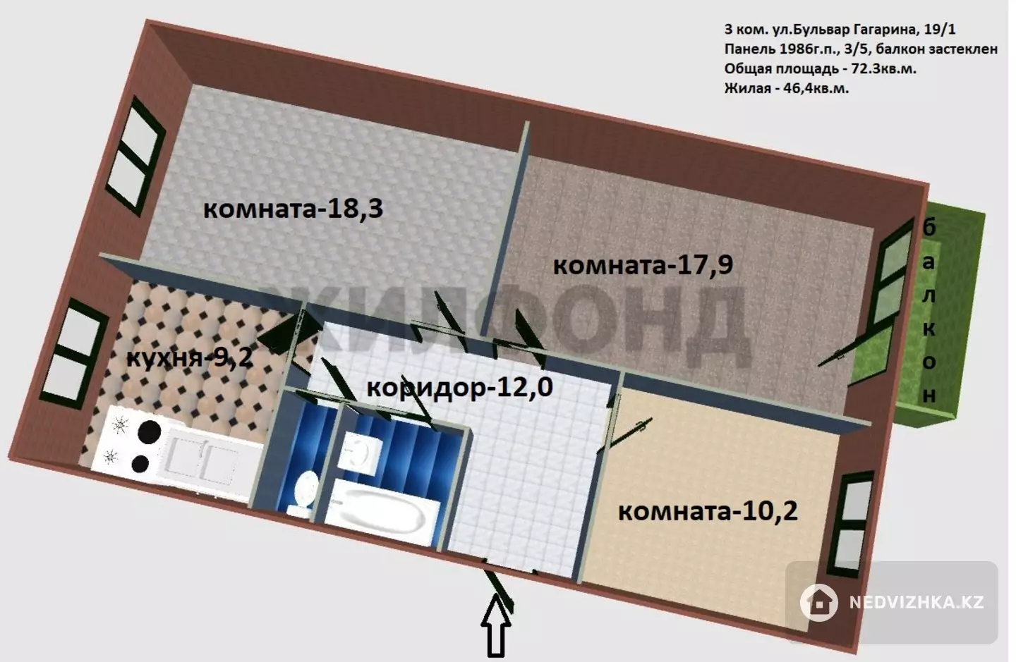 Продается 3-комнатная квартира на бульваре Гагарина, 19/1. Квартира расположена на 3 этаже панельного дома 1986 года постройки. Эта квартира улучшенной планировки отличается светлыми, теплыми и уютными помещениями, а также застекленным балконом и установленным кондиционером. Удобное расположение комнат позволяет наслаждаться солнечными днями, так как окна выходят на разные стороны дома. Раздельный санузел и большая прихожая со шкафом-купе добавляют комфорта. Все коммуникации (трубы, стояки, санузел) в отличном состоянии, установлены счетчики горячей и холодной воды. Во дворе всегда найдется место для автомобиля и прогулок. В непосредственной близости расположены магазины "Восход", "Ивушка" и "Меркурий", школы №7, 15, 28, детские сады, рынок "Дос-Нар", мини-рынок "Мирный", ТД "Октябрьский". Для отдыха можно посетить парк "Самал" и Октябрьский остров. Библиотека, поликлиника и другие магазины находятся в шаговой доступности. Остановки общественного транспорта расположены всего в 5 минутах спокойной ходьбы. Это превосходный вариант для семьи с детьми. Дом подходит под все ипотечные программы. Если у вас есть вопросы или вы хотите поторговаться, лучше всего это сделать на осмотре. Решайте свои жилищные вопросы с Жилфондом!Местоположение на карте