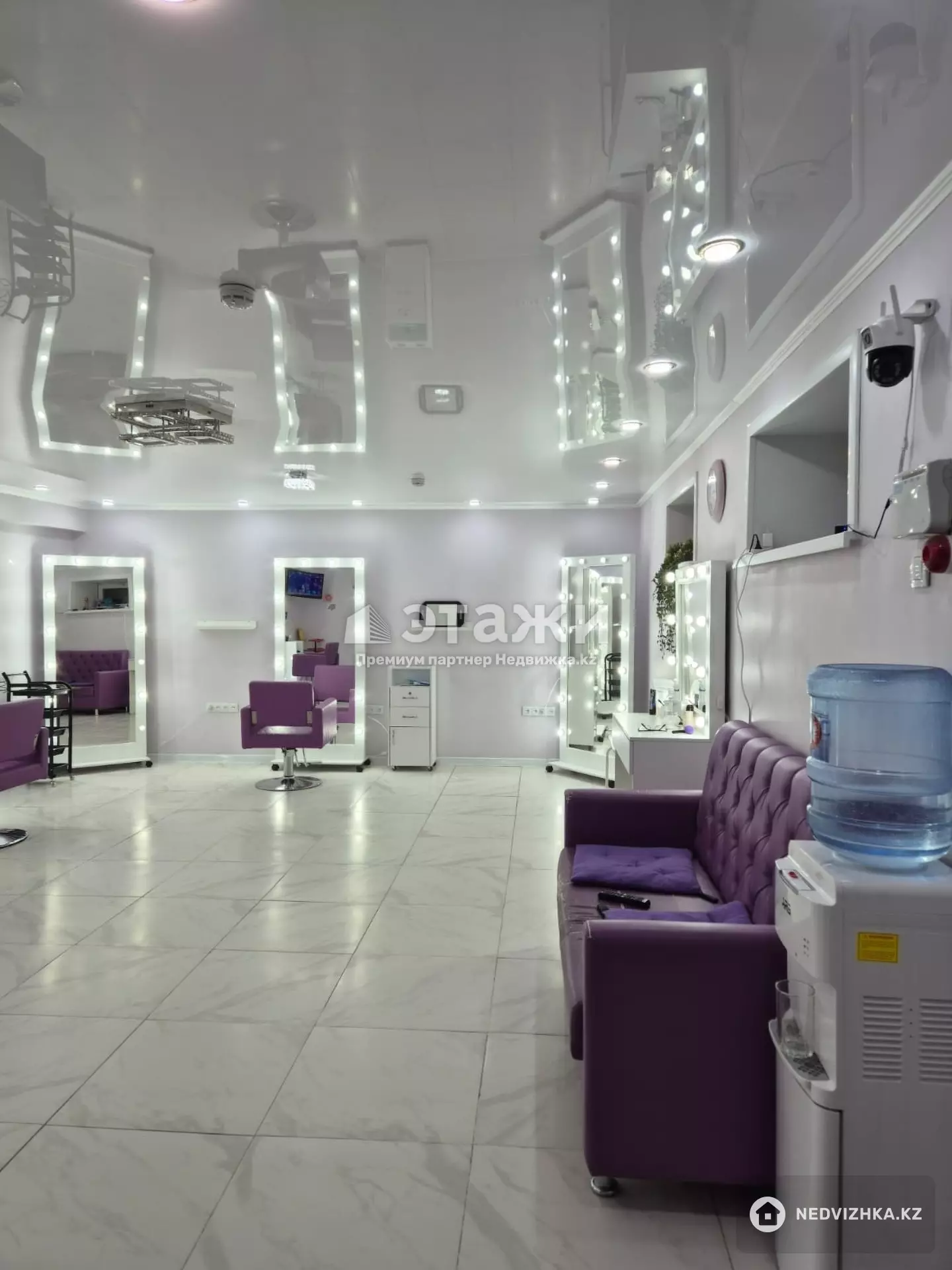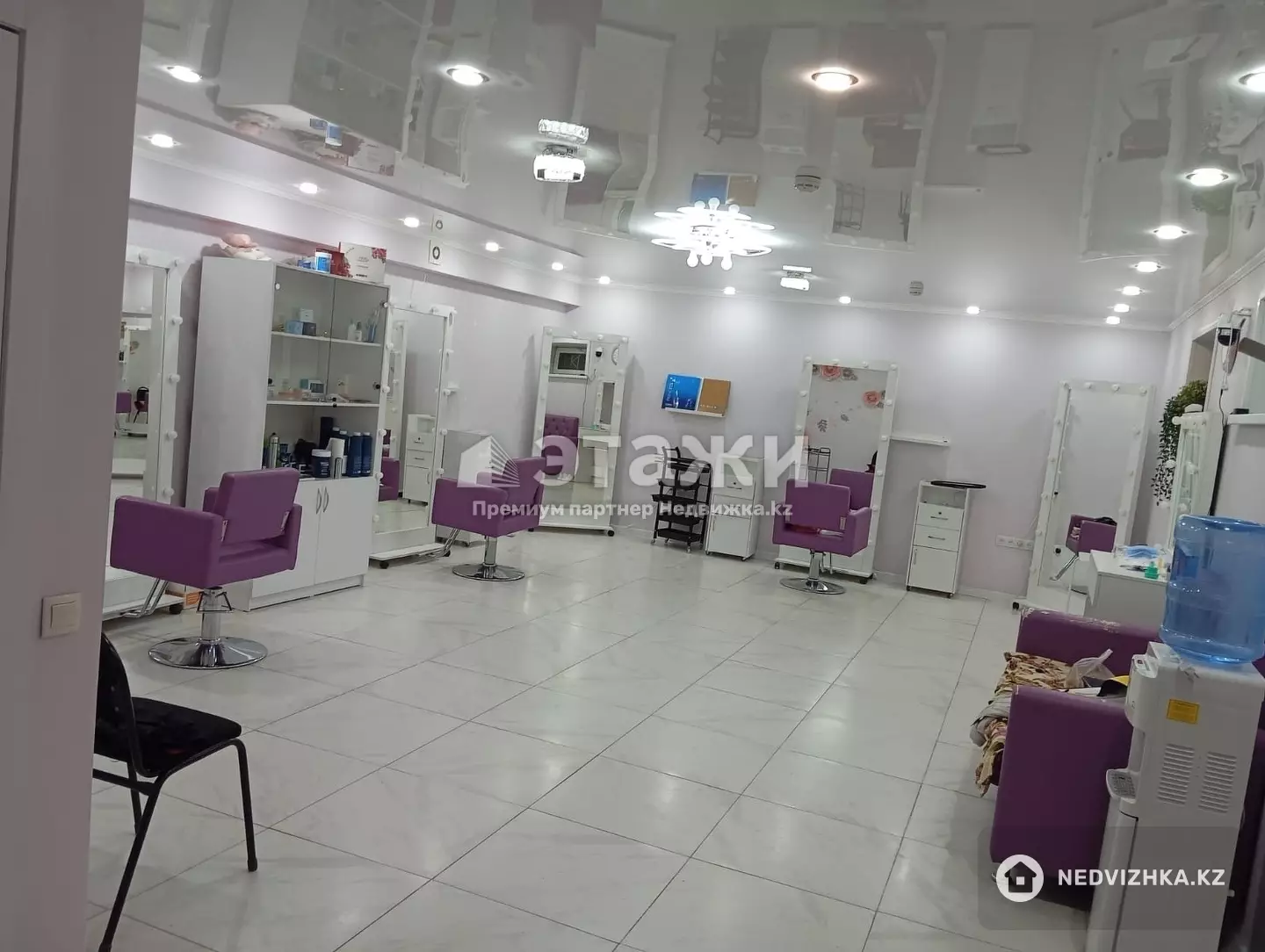 Навесной потолок,оборудование все останется,счетчики,фильтр для воды,сигнализация,пожарная безопасность все подключено,хорошее качественное оборудование ,удобные кресла,большие зеркала что позволяет профессионалам комфортно работать ,окна есть для проветривания помещения,отдельная кухня,стиральная машина,санузел