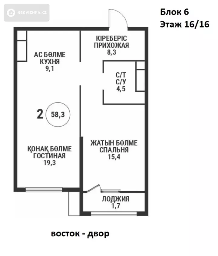 2-комнатная квартира, этаж 16 из 16, 58 м² в