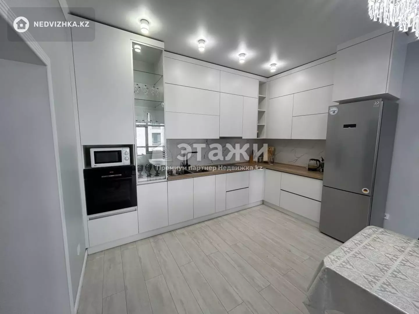 В квартире установлен новый большой кухонный гарнитур премиум-класса, который обошёлся более чем в миллион тенге.