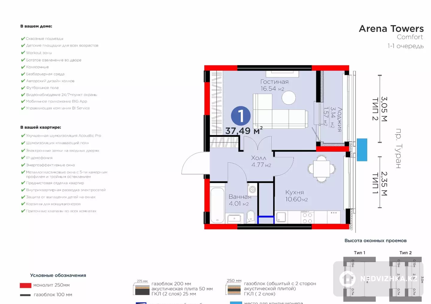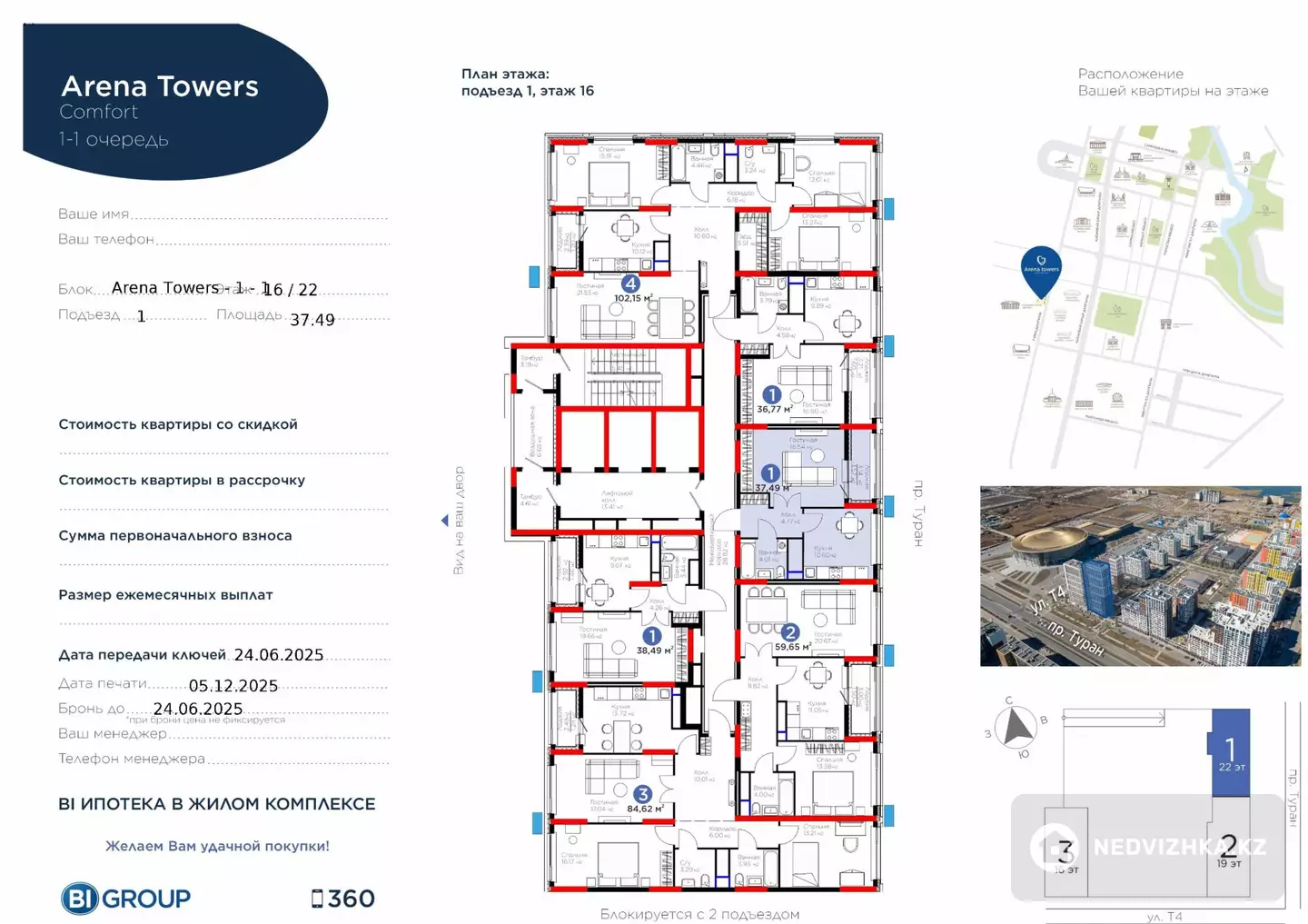 ЖК Arena Towers Astana Комнат: 1Площадь: 37.49 м²Этаж: 16 из 22Застройщик: BI GroupВысота потолков: 3 мДокументы на руках.Ипотека рассматривается. Новый дом от BI Group с встроенным паркингом.На площадке — всего 5 квартир.Квартира после ремонта, никто не жил. ТОП-локация: первая линия проспекта Туран.Панорамный вид, высокий 16 этаж.Все окна выходят на проспект Туран. Частично меблирована: кухня, прихожая.Встроенная бытовая техника.