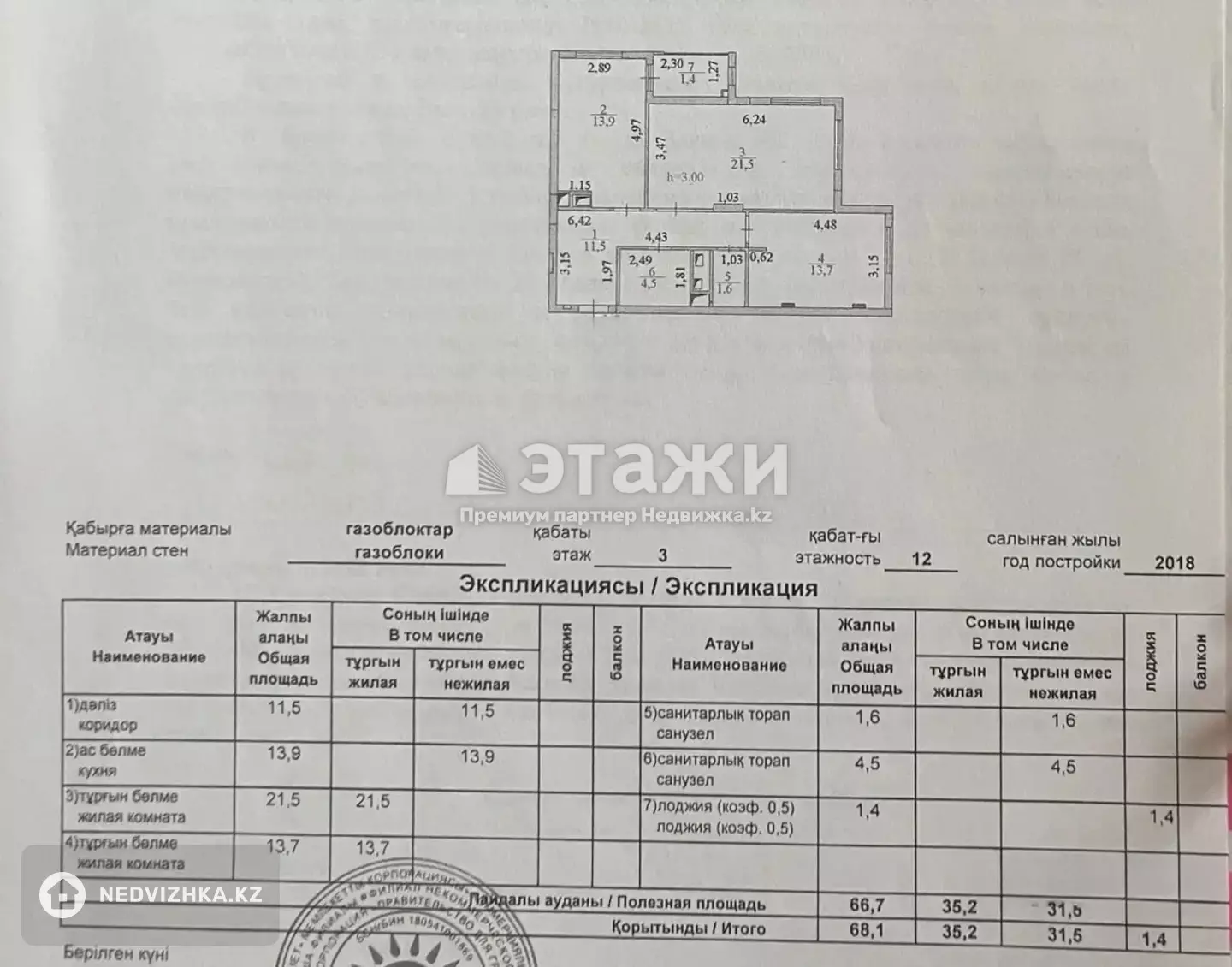 Площадь и потолки: Общая: 68.1 м² Жилая: 35.2 м² Нежилая: 31.5 м² Лоджия: 1.4 м² Потолки: 3 метра Этажность и блок: 3 этаж из 12. На этаже по 4 квартиры. В остальных блоках — 16 этажей Блок находится внутри двора, не вдоль улицы → тихо и комфортно В ЖК подземный паркинг, но у меня своего паркинга нет. Ремонт и состояние: Качественный ремонт от застройщика (квартира была шоурумом) ! Очень ухожена. Один владелец — он же и проживал, без детей и семьи. Причина продажи: переезд в другую страну. Мебель и техника полностью остаются: кухонный гарнитур, холодильник, микроволновка, стиральная машина, телевизор, диван, шкафы, кровать и др. Планировка: Зал, Спальня, Отдельная кухня, Раздельный санузел (ванная и туалет раздельно), Коридор, Прихожая Дом: Монолитный, бизнес-класс Год постройки: 2018, заехали в июне 2019 2 лифта Отдельный блок (внутри двора) Инфраструктура: Рядом: Expo, ботанический сад, Триумфальная арка, школа, ТЦ Mega Silk Way (~15 мин пешком) Внутри ЖК: внутренний двор, детские и спортивные площадки, коворкинг, охраняемая территория Магазин на 1 этаже, рядом: Magnum, ателье, сапожник, автомойка, автобусная остановка и др. В ЖК имеется подземный паркинг. Доп. описание: санузел раздельный, пластиковые окна, в доме есть: детская площадка, открытый двор, наземный паркинг, подземный паркинг, лифт пассажирский, лифт грузовой, современный ремонт, также имеются: телефон, интернет, кабельное телевидение, счетчики холодной и горячей воды, домофон, железная дверь Номер в базе: 12124667. Район: ЕсильскийМестоположение на карте