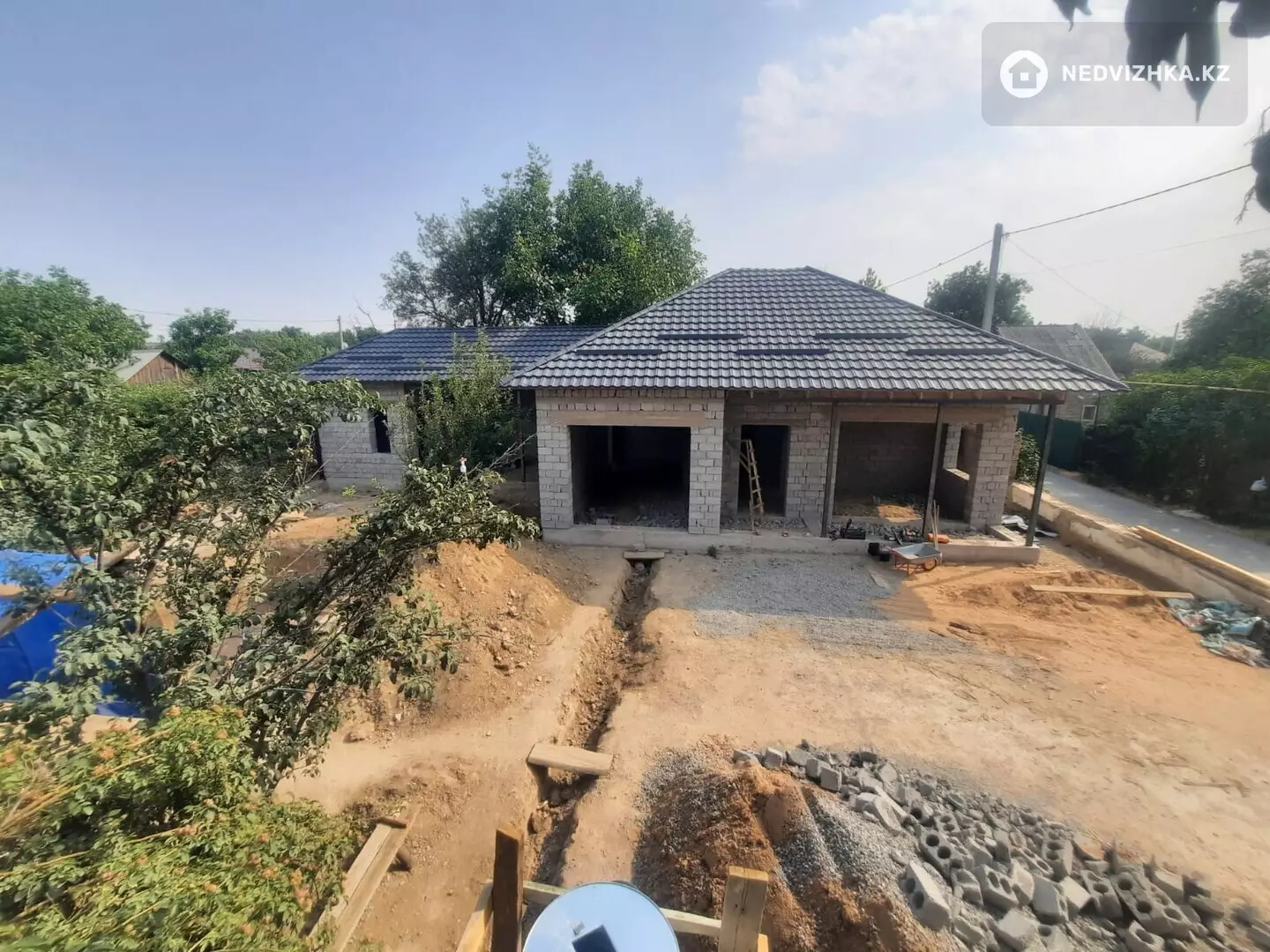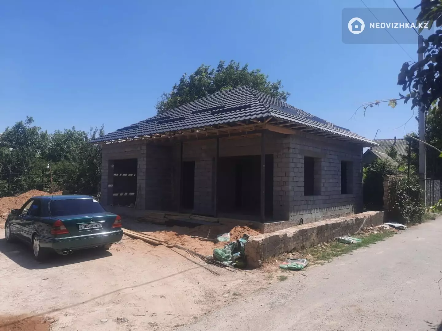 Стоит дом с крышей готовой, без отделки.