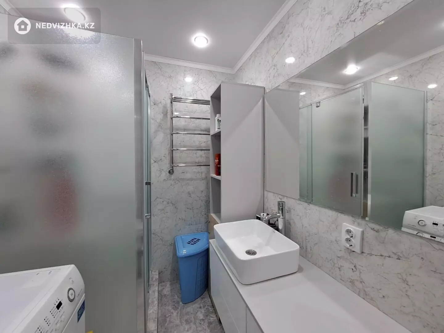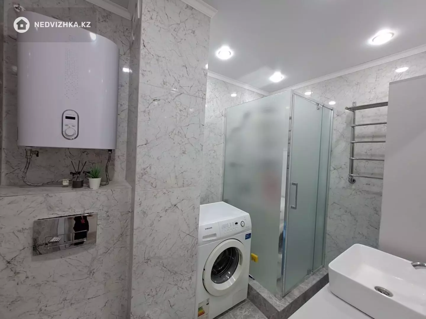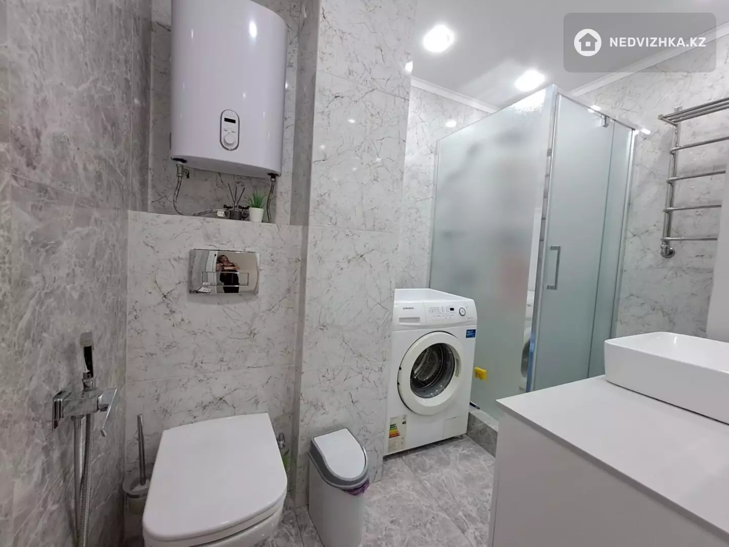Современная ванная: душевая кабина, инсталляция Geberit, подвесной унитаз