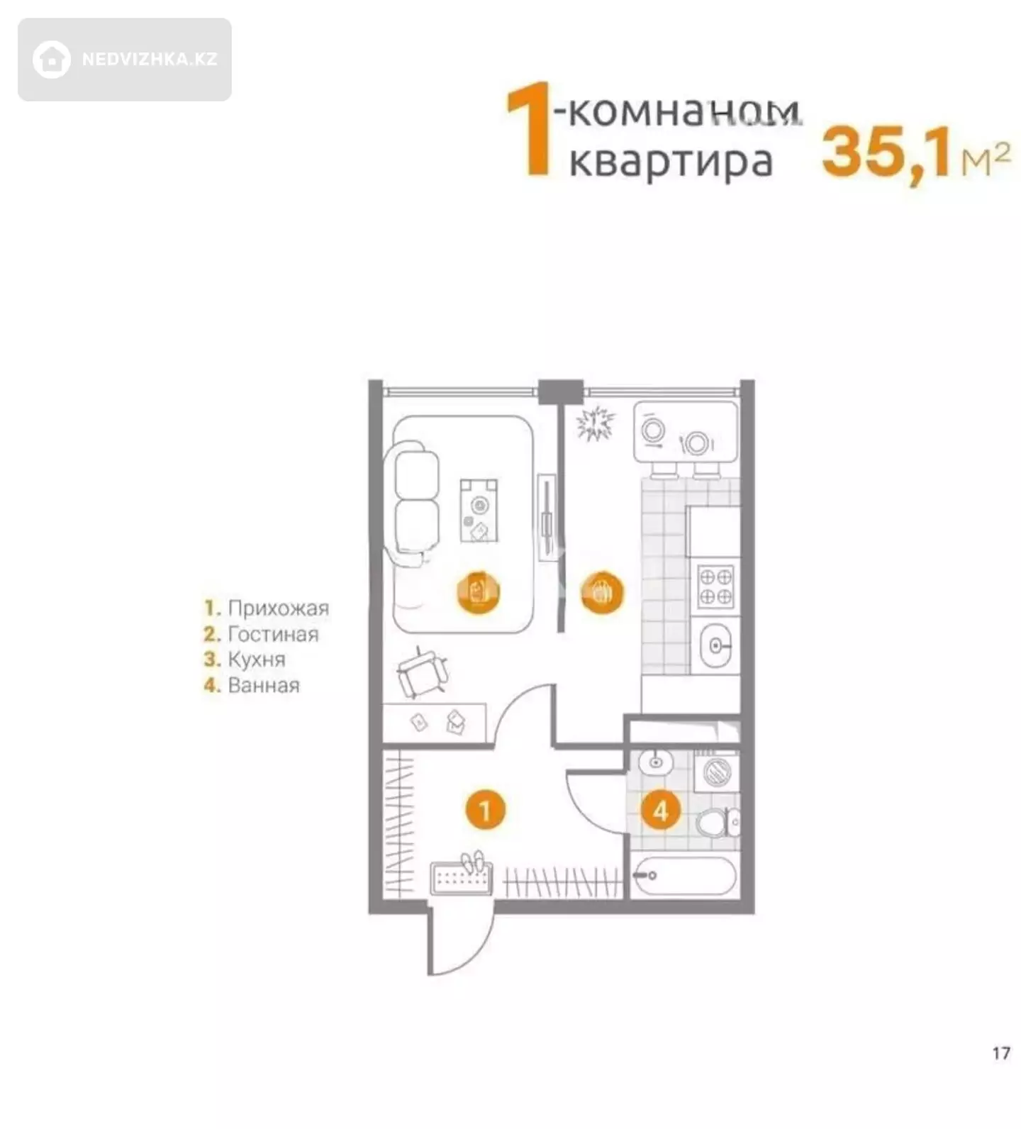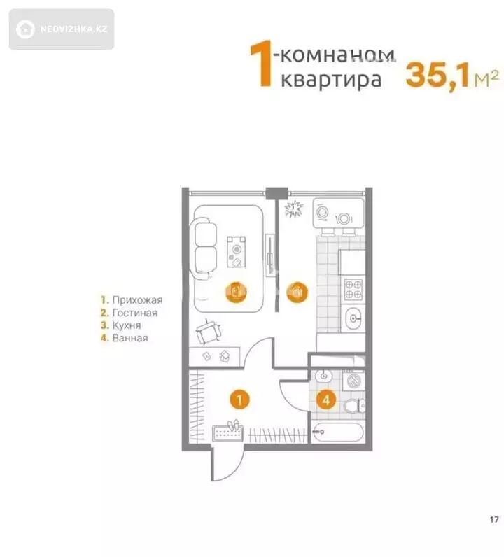 1-комнатная квартира, этаж 4 из 9, 35 м² в