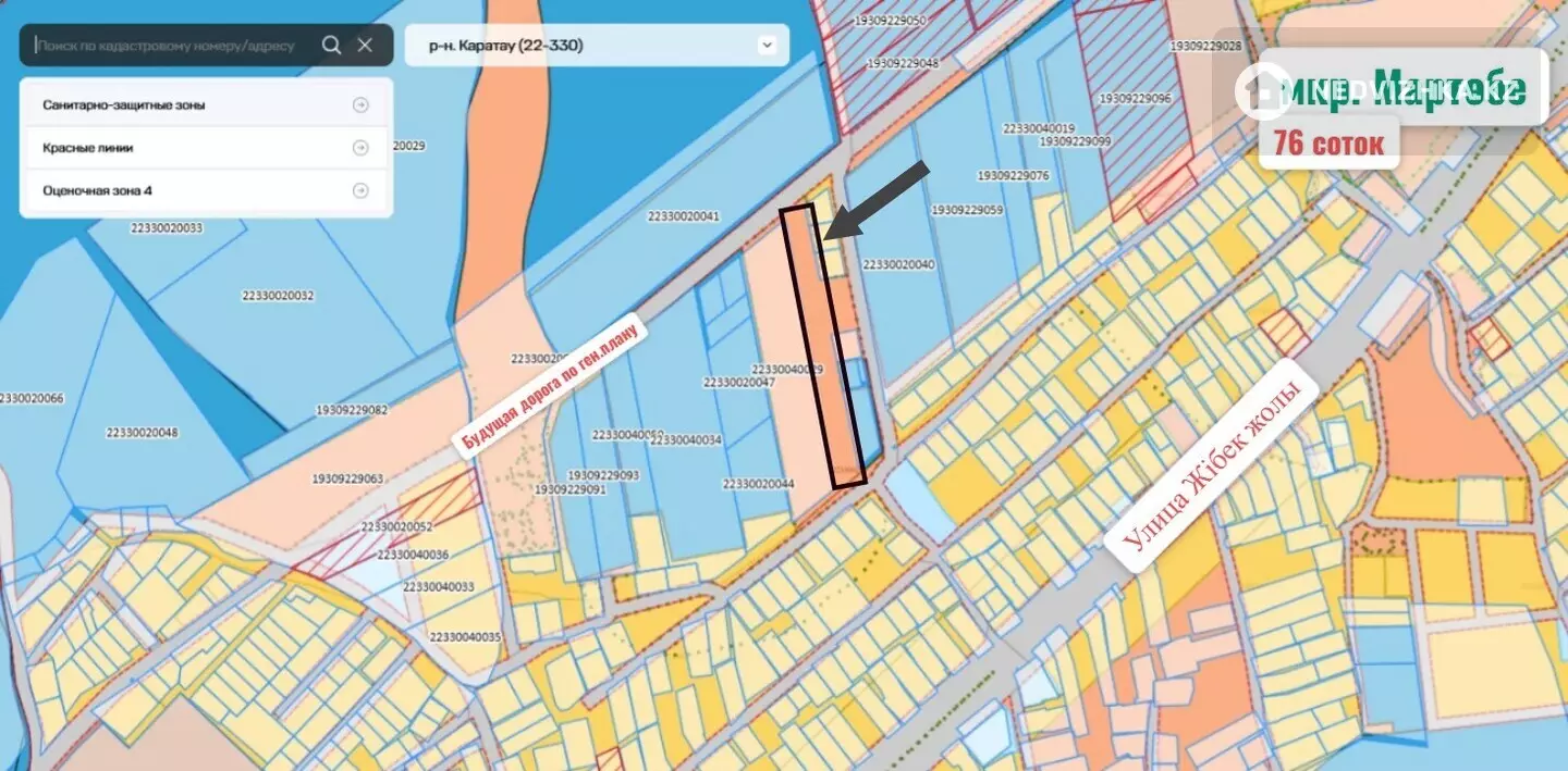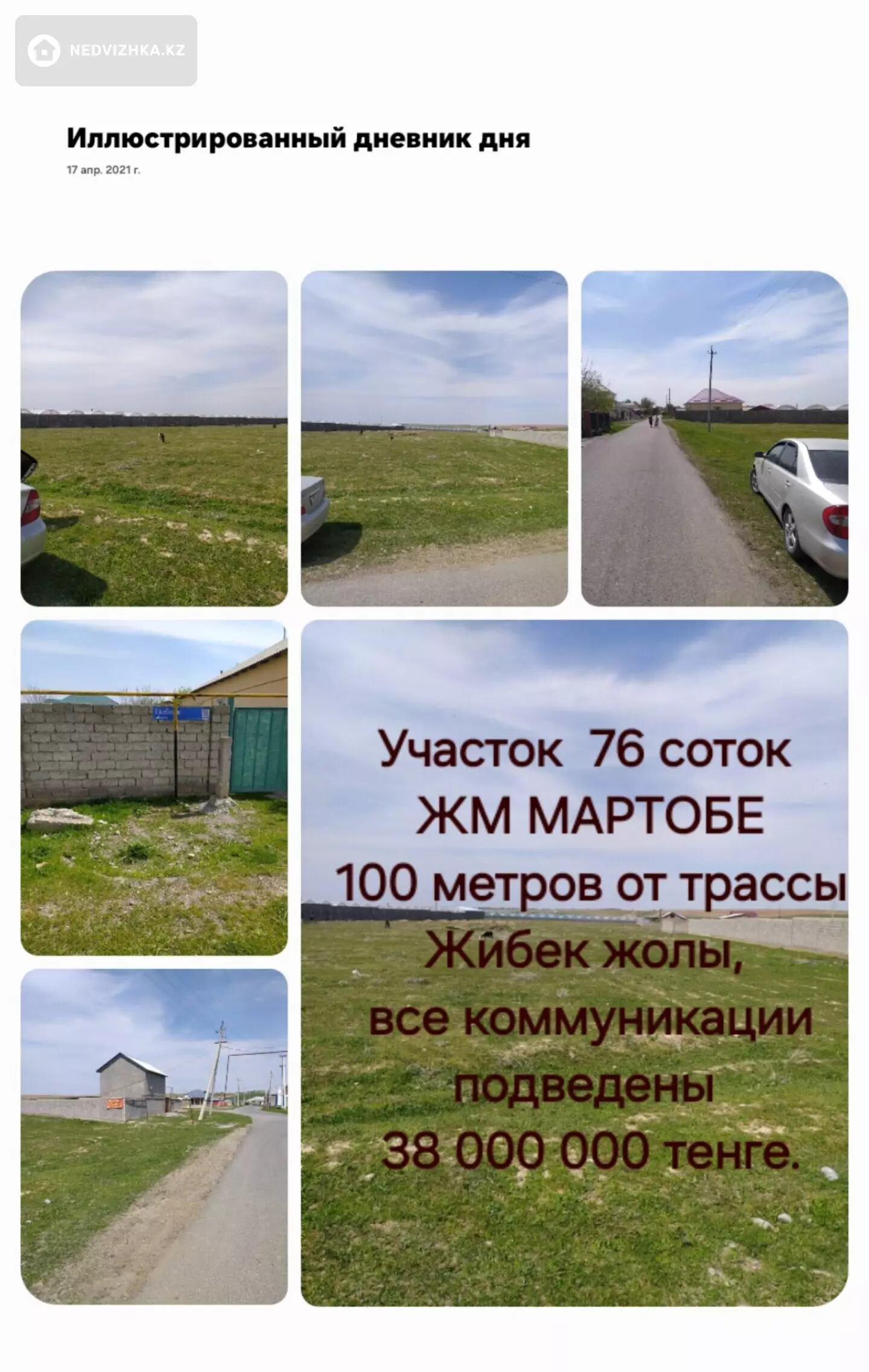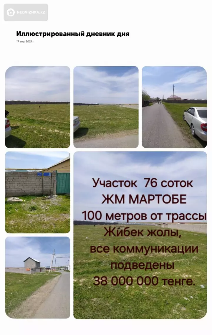 , ЖМ, мартобе ", от трассы Жибек жолы - 100 метров. Вокруг жилые дома и Теплицы. 76 соток (по факту гектар земли). Идеальное место для строительства ТЕПЛИЦЫ, СКЛАДСКИХ ПОМЕЩЕНИЙ, ШКОЛЫ. Все коммуникации подведены. ДВА заездА. СЗАДИ УЧАСТКА БУДЕТ ПРОХОДИТ ШИРОКАЯ ТРАССА, ПАРАЛЛЕЛЬНО Жибек жолы! За участком начилось строительство Аграрно-тепличного комплекса, по новым технологиям, на 144 га. Наш Аким подписал договор с Польской компанией, Фабе-Агро".