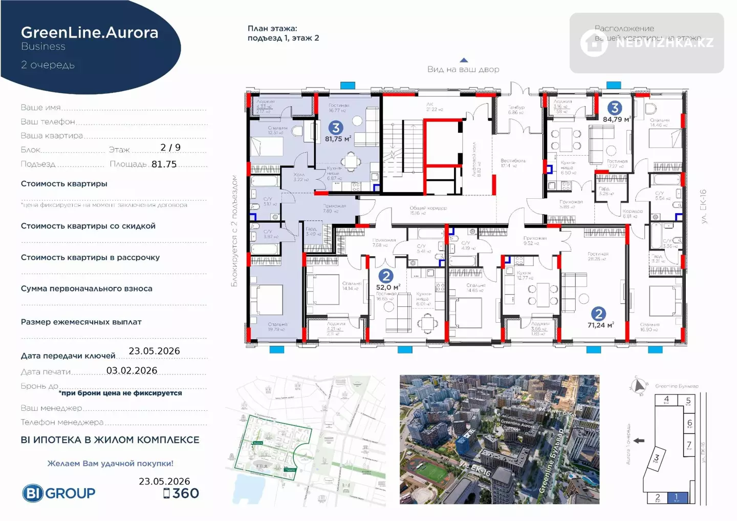 Продается 3-комнатная квартира в ЖК GreenLine Aurora2 очередь, подъезд 1Этаж: 2 из 9Площадь: 81,75 м²Класс жилья: BusinessДата передачи ключей: 30.06.2026 О квартире: Не угловая, всего 4 квартиры на площадке Предчистовая отделка, электрика проведена полностью Видеодомофон и электрозамки Усиленная шумоизоляция Функциональная планировка, удобная для семьи
