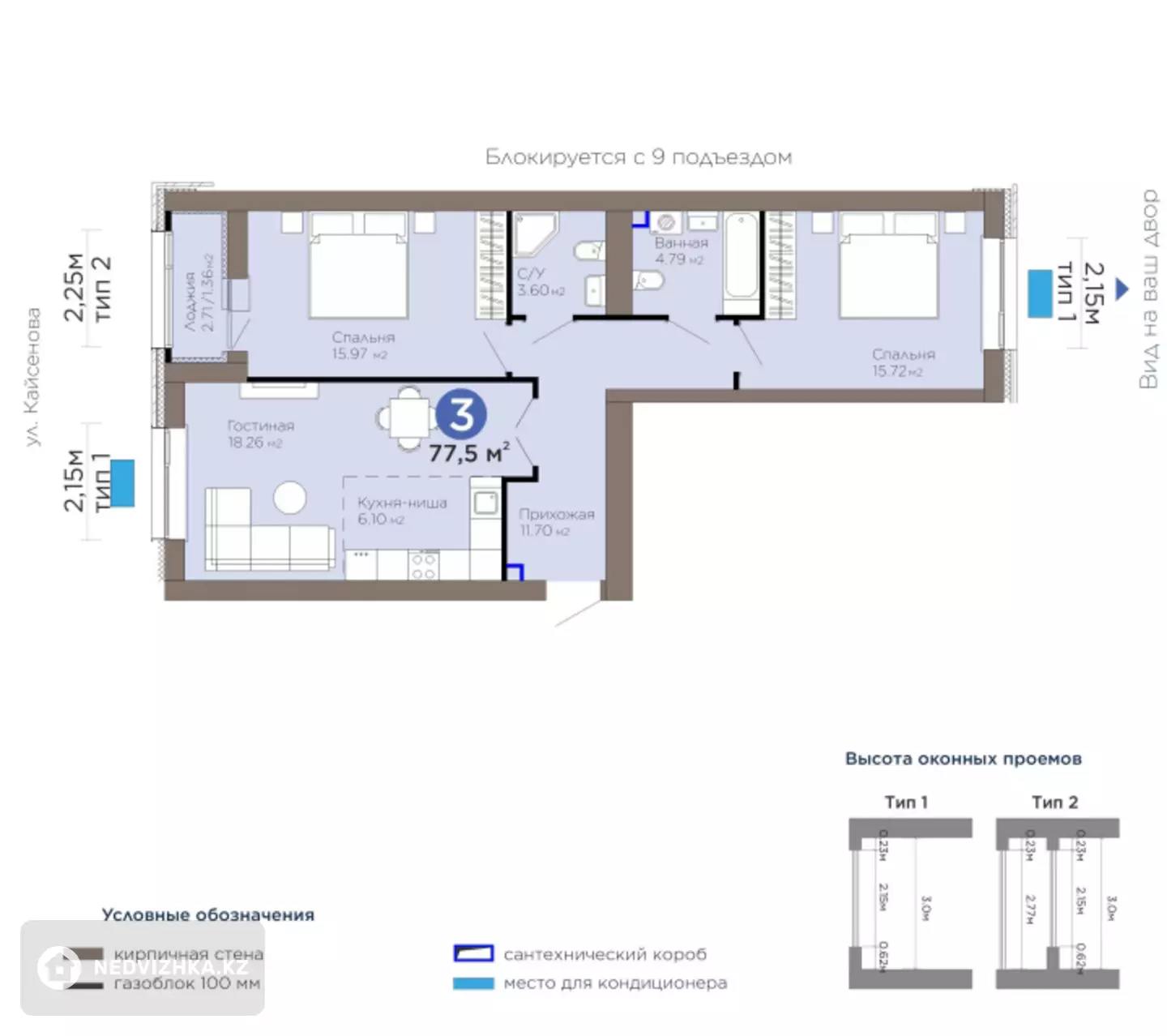 ? Отличная локация Жилой комплекс расположен на пересечении улиц Хусейн бен Талал и Касыма Кайсенова. Тихий и уютный район, при этом рядом вся необходимая инфраструктура.