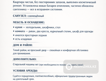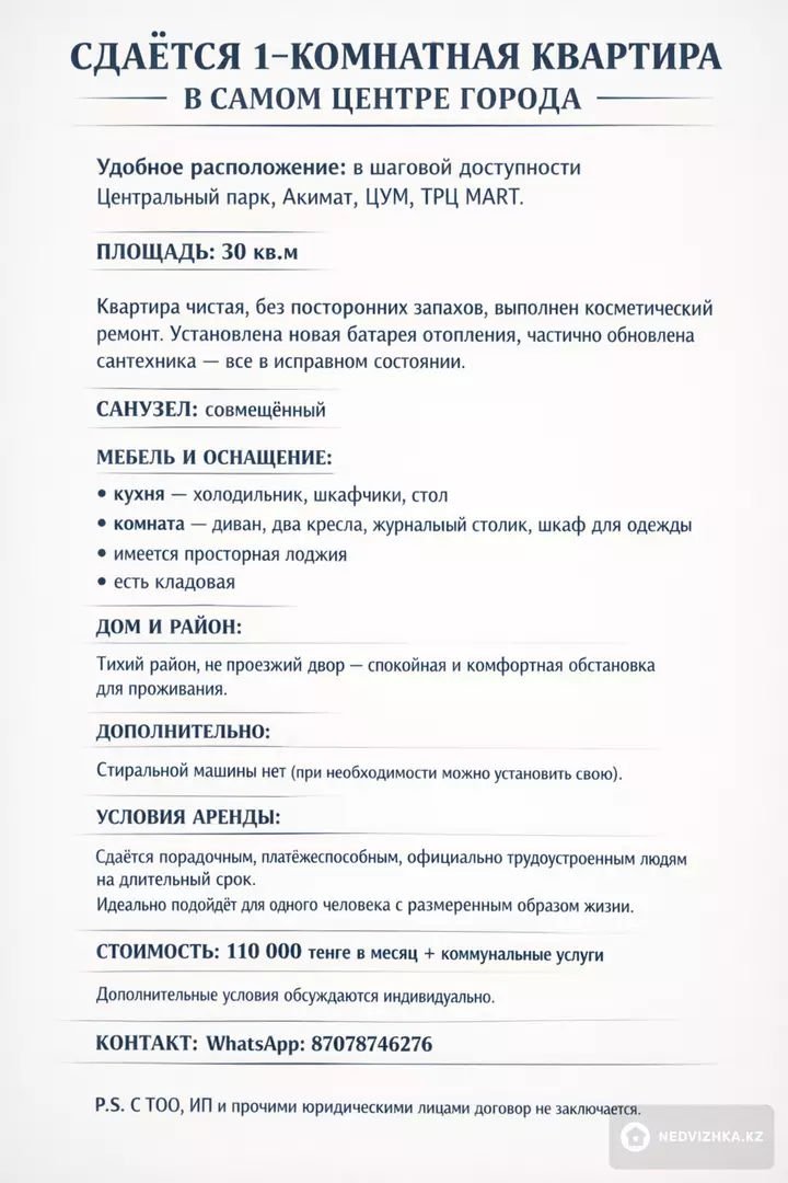Сдаётся 1-комнатная квартира в самом центре города. В шаговой доступности: центральный парк, акимат, ЦУМ, ТРЦ MART. Площадь — 30 кв.м. Санузел совмещён. Квартира чистая, без посторонних запахов, выполнен косметический ремонт. Установлена новая батарея отопления, частично обновлена сантехника — всё в исправном состоянии. Квартира частично меблирована: на кухне — холодильник, шкафчики, стол; в комнате — мягкая мебель (диван, два кресла), журнальный столик, шкаф для одежды. Есть просторная лоджия. Дом расположен в тихом районе, двор не проезжий. Стиральной машины нет (при необходимости можно установить свою). Сдаётся порядочному, платёжеспособному, официально трудоустроенному человеку на длительный срок. Идеально подойдёт для одного человека с размеренным образом жизни. Стоимость: 120 000 тенге + коммунальные услуги. Без животных и детей. Страховой депозит. Договор . Пишите текст в ватсапп 87078746276. Отвечу всем по мере возможности.Местоположение на карте