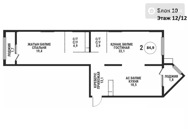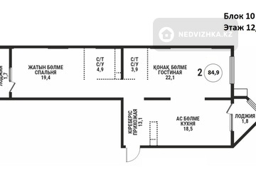 2-комнатная квартира, этаж 12 из 12, 85 м² в