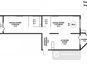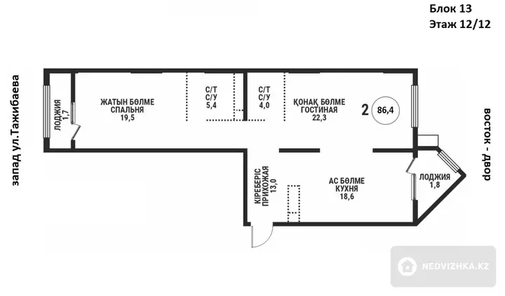 2-комнатная квартира, этаж 12 из 12, 86 м² в